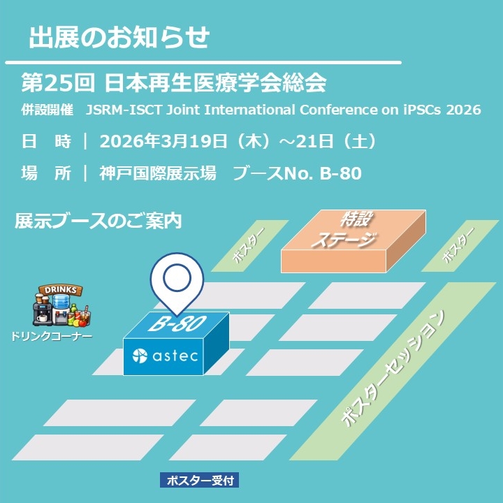 このたび弊社は、2026年3月19日(木曜日)~21日(土曜日)に神戸国際展示場で開催される「第25回 日本再生医療学会総会」ならびに「JSRM-ISCT Joint International Conference on iPSCs 2026 」へ出展いたします。