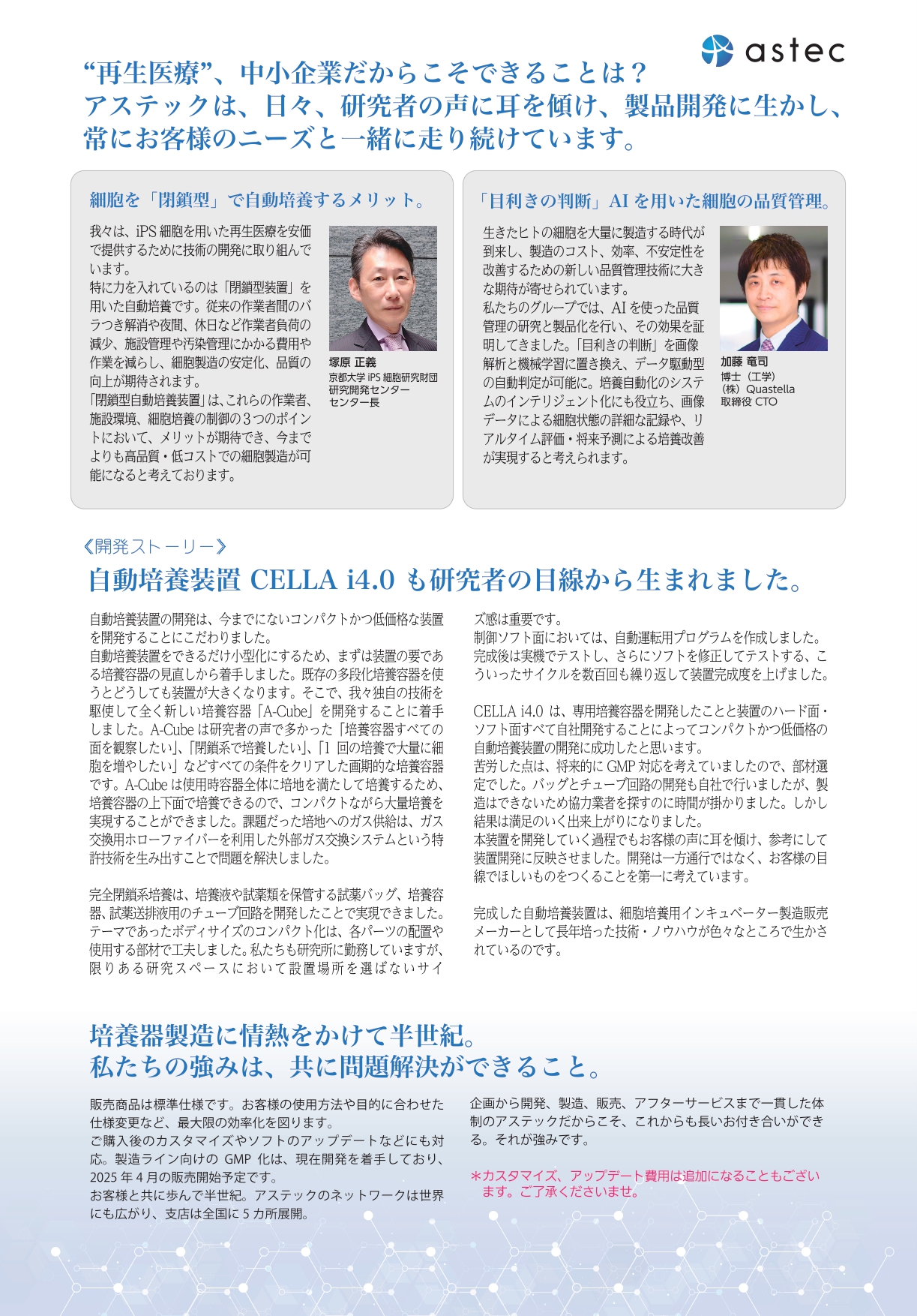 会期中は、iPS細胞やMSCなどの幹細胞を自動培養できる「CELLA i4.0🄬」を用い、iPS細胞培養における具体的な活用事例および得られた成果について発表いたします。